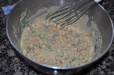 Whisk together chickpea flour, cumin, chili powder, and salt in a bowl. Whisk in 3/4 cup hot water and then stir in the remaining ingredients.